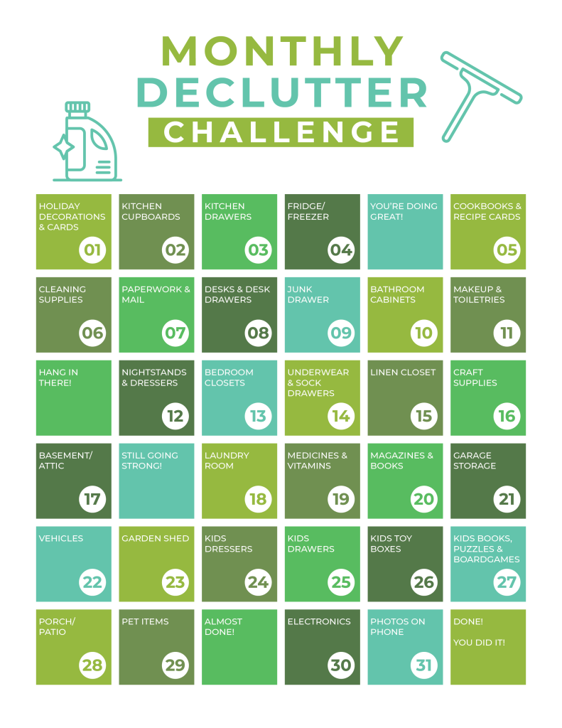 Are you a visual person? If you are like me, I need something visual to keep me on track. This visual calendar not only gives you a clear plan of attack for your 30-day declutter challenge, but it also gives you a visual reminder each day to help keep the plan in front of your mind.