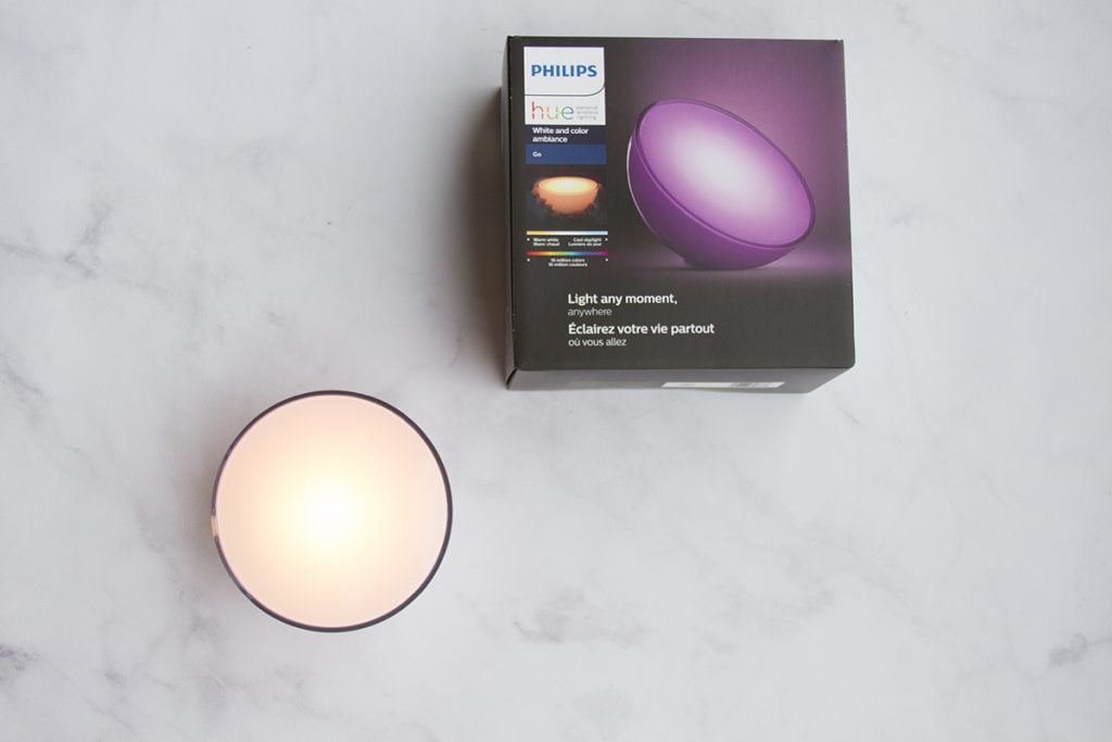 Now, let’s take a look at how we are setting the mood for Halloween on our porch. The Philips Hue Go is a rechargeable, portable accent light that we’ve used as a nightlight in my girls’ rooms for several years. They love it because they choose any color light they want before bedtime.