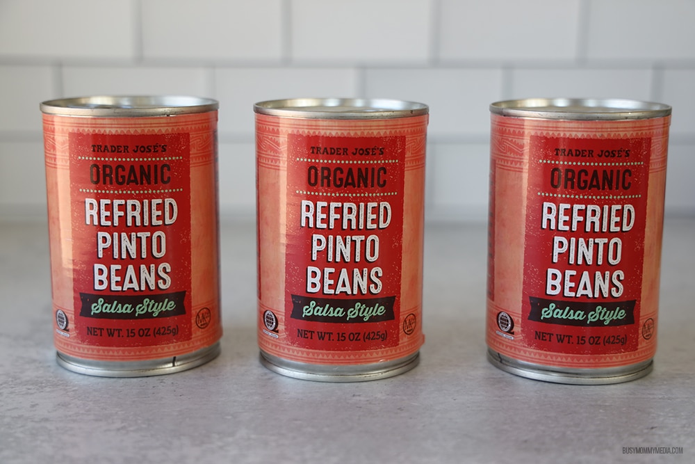 I ALWAYS stock up on the salsa style refried pinto beans at Trader Joe’s. These things make a basic bean burrito taste amazing. We throw these on burritos, tacos, tostados, and everything else we can think of.