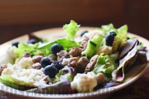 Rinse the lettuce and dry well to avoid a soggy salad. I like using a salad spinner but laying the lettuce leaves out on paper towels will work just as well. Slice the cucumbers, celery, and cauliflower into bite sized pieces and toss with the lettuce. Layer the blueberries and date nuggets on top. Date nuggets are small, slightly candied dates that add a delicious sweetness to the salad. Top the salad with a small amount of mozzarella cheese. You can go light on the cheese because the cauliflower does wonders for tricking your brain and the dates and blueberries add enough flavor that you won’t even miss the cheese if you want to leave it out completely.