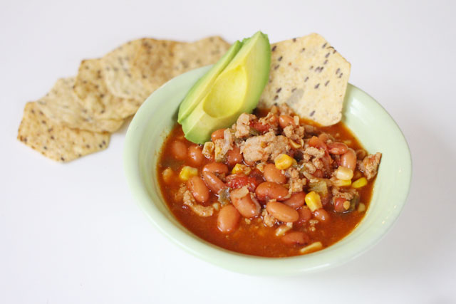 Serve with sliced avocado, a dollop of sour cream, cheese, and tortilla chips.