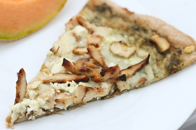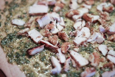Spread a thin layer of pesto on the pizza dough, leaving about an inch around the edge as a crust. Be sure and spread the pesto evenly and remember that a little goes a long way.