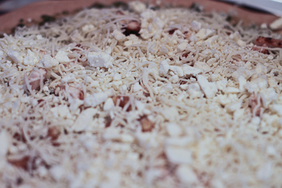 Sprinkle cheese on the top, gradually putting down a thinner layer as you work your way towards the edge of the pizza to avoid cheese melting over (not that there’s anything wrong with gooey cheese. As far as I’m concerned, you can never have enough cheese).