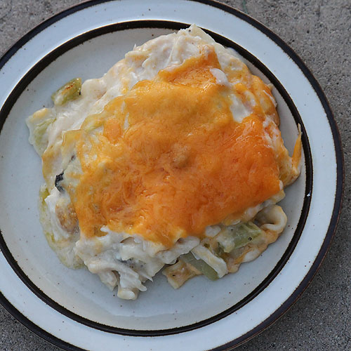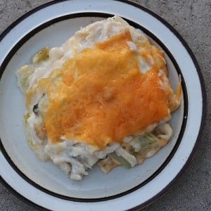 In a buttered 9×12 inch baking pan, layer the noodles (I add in some of the onion and celery the noodles were cooked with at this point just because it adds a nice touch), chicken mixture, and grated cheese in alternating layers ending with cheese.