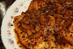 you taste the flour) with marjoram/rosemary, salt, pepper and garlic or whatever spices you are using. Brown in olive oil over medium low heat until nearly, but not quite done. Remove chicken from pan and set aside. Add mushrooms to the pan and brown over medium heat. Deglaze pan with the mushrooms still in with a good quantity of marsala, scraping up bits with a spoon. Add a few tablespoons of butter, bring up to a simmer and add bouillon or broth. Reduce the sauce to between 2/3s and half of the original volume, taste and adjust seasoning with salt, pepper, sugar (optional–depends on the quality of the marsala you’re using) and more marsala if needed. When thickened enough to stick to the pasta and concentrated to your liking, add chicken back to pan and finish cooking. Remove from heat and transfer chicken to a platter, then pour mushrooms and sauce over top. Alternately, you can drain off a lot of the sauce from the mushrooms before topping the chicken and pass the sauce separately in a gravy boat. Chop a large quantity of fresh parsley and sprinkle generously over platter or plates.