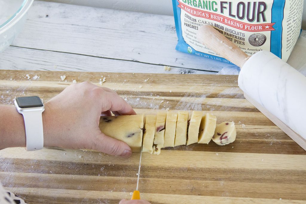 Roll until the dough forms a 1/2 inch roll (or larger if you want larger cookies), wrap in plastic wrap, and refrigerate for 20-25 minutes, or until the dough firms up.
