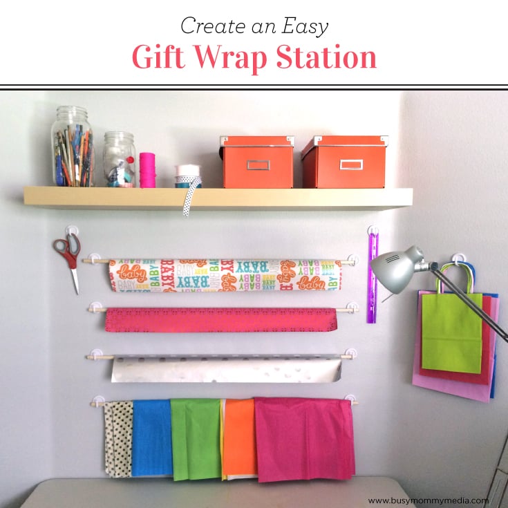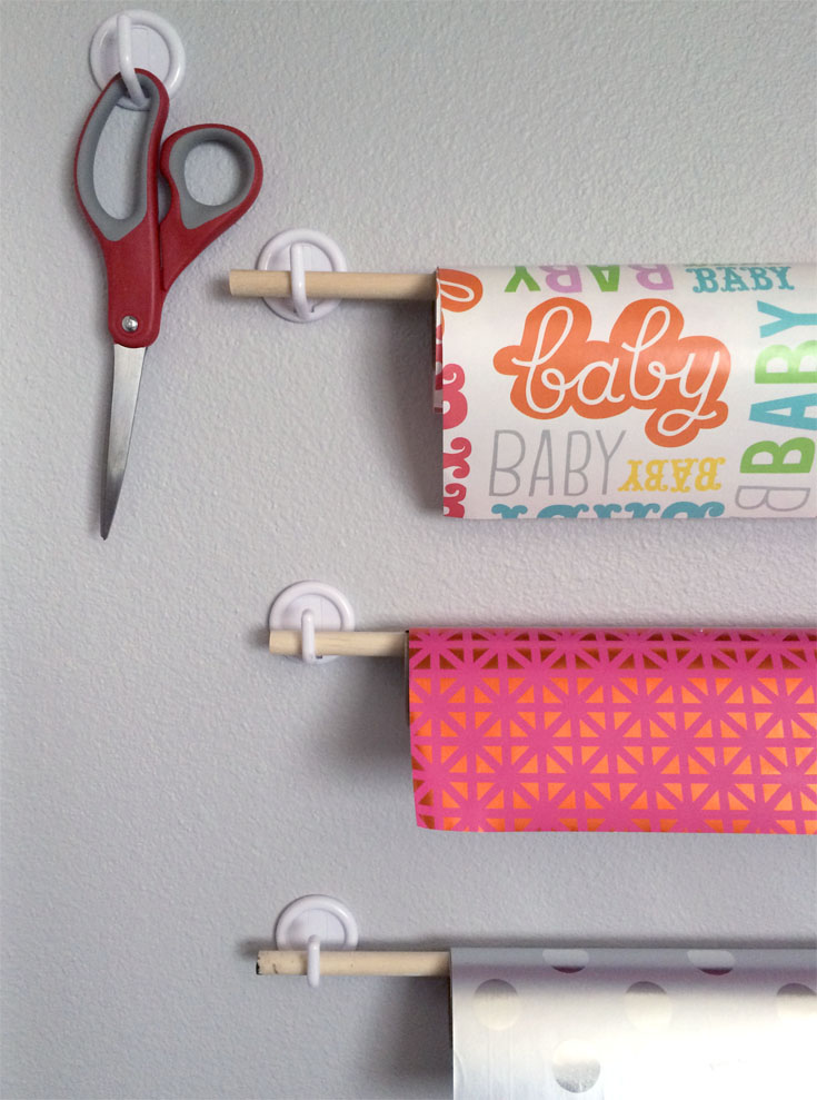 I am not very handy and I wanted to go the easiest route possible with creating a beautiful gift station so I came up with the idea to use stick on wall hooks and wooden dowels to hang my wrapping paper. I found the hooks and dowels I needed at Walmart for under $10! Putting everything up took me about 5 minutes total.