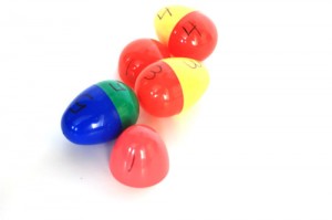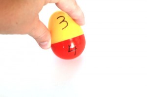 Use a permanent marker to write the numbers 1-10 on the top and bottom of the plastic Easter Eggs. You can make this game a bit easier by putting matching numbers on the same color eggs or a bit more difficult by mixing the colors up so that the matching numbers are on different color eggs.