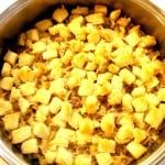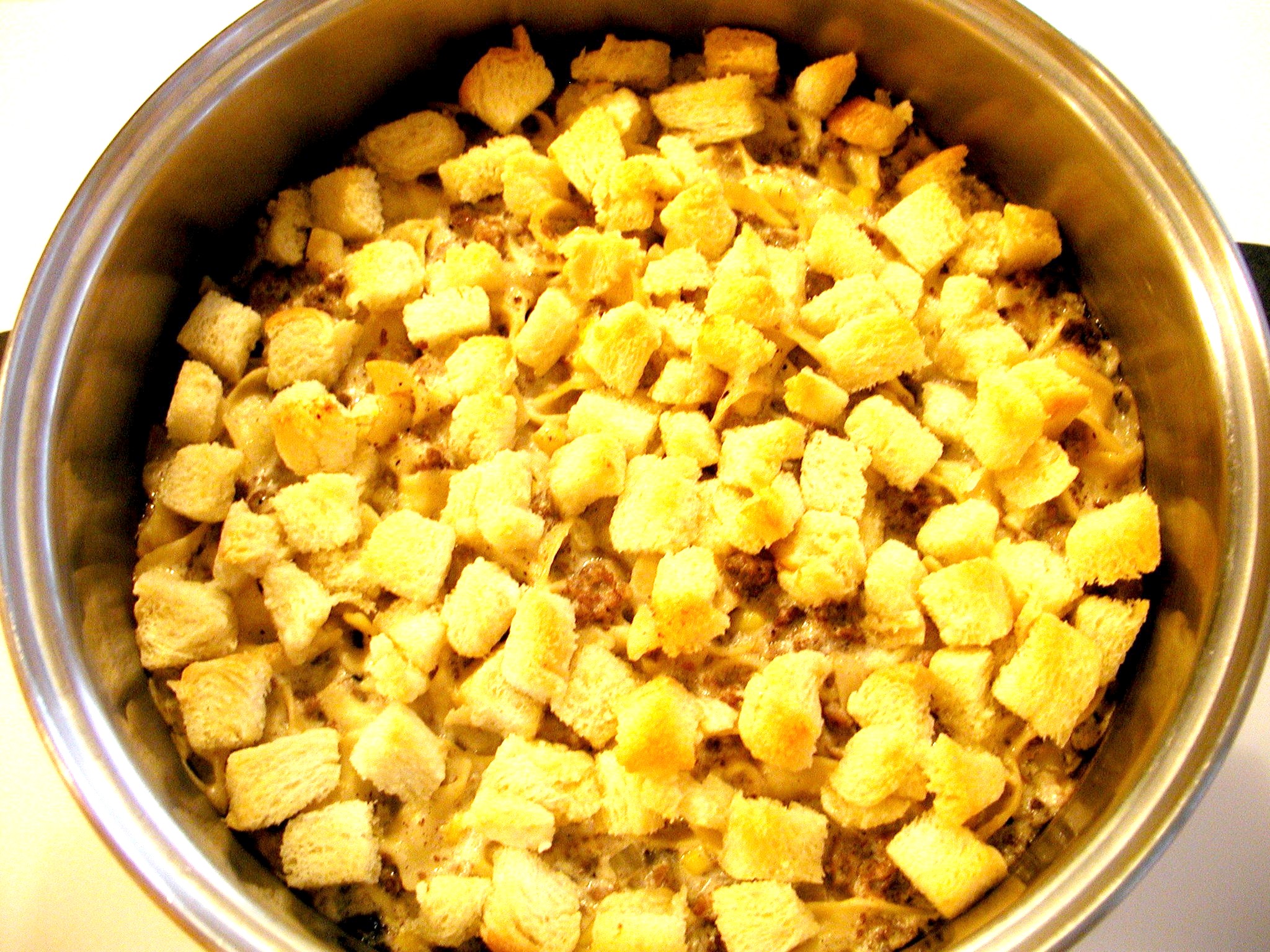 Cut the crust off of 6-7 slices of bread then cut the bread into one-inch cubes and toss in the melted butter. Sprinkle the cubed bread over the top of the casserole. Take a paper towel and wipe off any of the casserole mixture that is on the side of the pan so it does not burn.