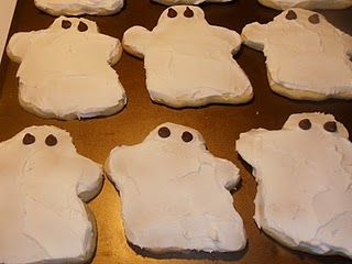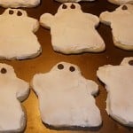 I have never paid more than $0.50 for cookie cutters. I always buy them after the holiday when they mark stuff down and I have a large collection. I used the Wilton Ghost Cookie Cutter for these, but you could also use the Wilton Pumpkin Cutter. I also think these Tombstone Cookie Cutters would looke real cute. I have found that the bigger and sturdier Wilton cutters do better with these cookies. So, look around and decide what you want to do. For the ghost, I just used chocolate chips for the eyes. You could tent your icing to make the pumpkin orange and the stem brown. They also sell lots of decorating colored sugars and other decorating sprinkles you could use on them. I also buy these after the holiday and have never paid more than $0.50 for them. So, just get creative and decide what you want to use. Don’t forget to include your children. They love decorating cookies.