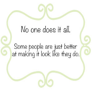No one does it all. Some people are just better at making it look like they do. We have to remember too, that “Doing it all” looks different for different people. Someone may look at us and think we are absolutely perfect because we succeed in something they put importance on. Most of us aren’t walking around thinking that we ARE doing it all.
