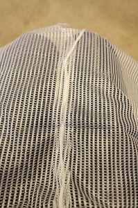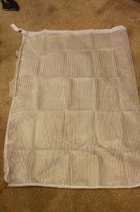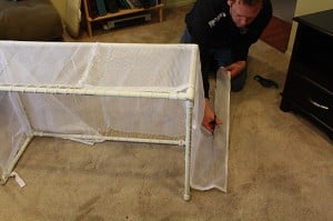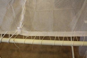 7. Take the mesh and fit it around the frame. Use the other drawstring to stitch the mesh to the PVC frame (we had to supplement with the twine because the drawstring only covered two of the sides).