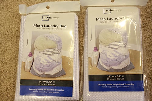 5. Cut the laundry bags so they lie open. Do not cut all the way around. Reserve the drawstring and use one to sew two horizontal sides of the bags together. Tie a knot at the ends.