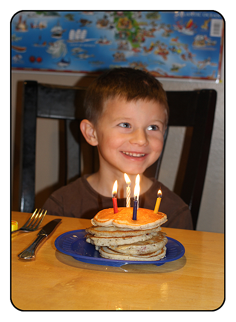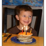 1. Make Small Things Exciting – I really wanted to make an effort to make the entire day special for my newly 5 year old. I remember growing up how exciting it was just to wake up in the morning on your birthday and I didn’t want him to have to wait all day for the excitement to start. Small things can make kids feel really special. We started out by making pancakes for breakfast (easy pancakes from a mix, not anything that would win me a chef of the year award). My son got 5 pancakes because he was 5 without any pressure to have to eat the whole stack if he didn’t want to. He loved having a huge stack of pancakes stuck in front of him and we took the opportunity to stick candles in the whole thing and sing “Happy Birthday” while we were at it.