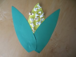 Preschooler Participation – Have each preschooler glue the green corn husks to the yellow piece of corn. Talk about how dried corn kernels are heated to make popcorn. Have preschoolers dip the popcorn in the glue and place it on the yellow piece of corn. Let preschoolers fill the yellow corn with pieces of popcorn.