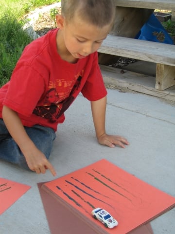 Car Tracks Painting Activity –Â Preschoolers will love this easy transportation art activity that is easy to do at home or in the preschool setting. Drive old cars through paint and drive them on pieces of paper to create unique preschool art.