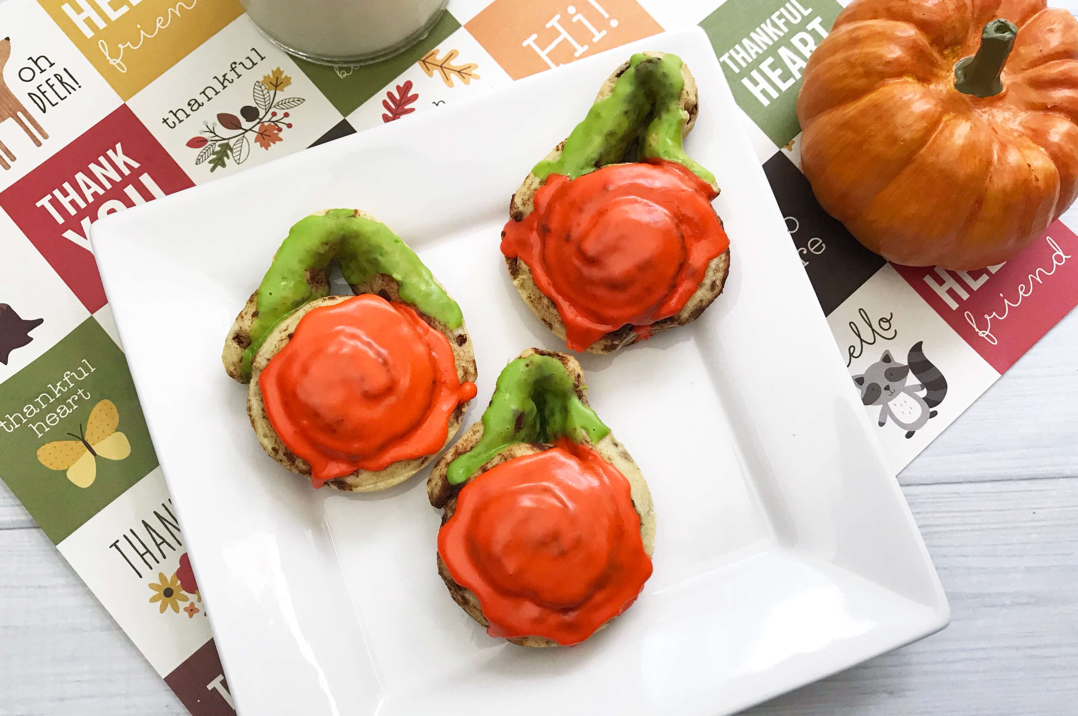 Generously frost the cinnamon rolls with the orange and green icing so they look like pumpkins!