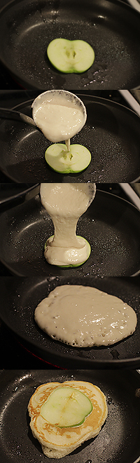 Lightly grease your frying pan and lay an apple in the pan. Let this cook for about a minute so it will start to get soft, then pour your pancake mix directly over the top of the apple slice.