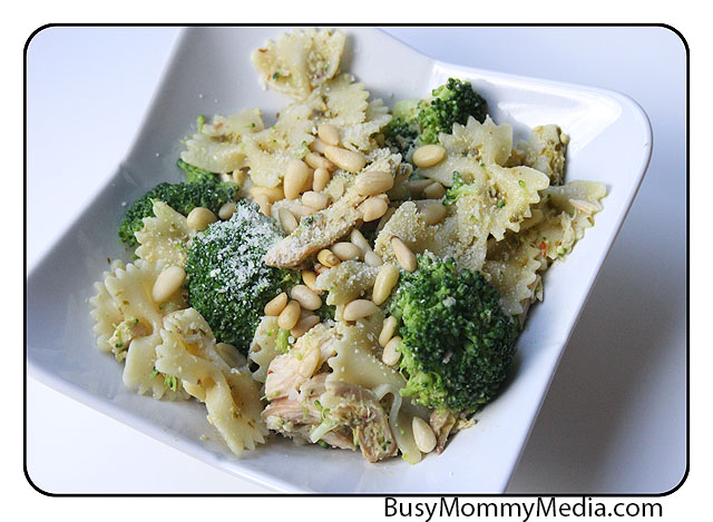 Throw in the broccoli pieces, cooked chicken, and pesto. Toss until the pesto covers the noodles evenly. I like pesto and could probably eat it plain so I throw in the whole jar. If you want a milder taste, add a bit at a time until you get the right balance of flavors.