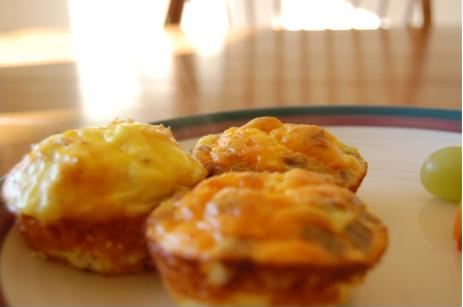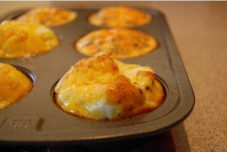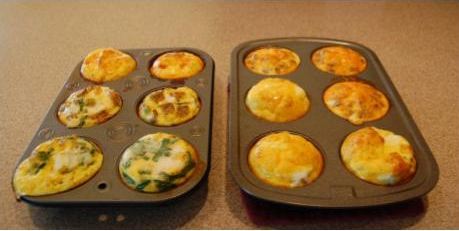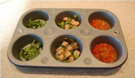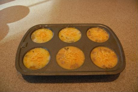 In your prepared muffin tins, place your fillings. This is the fun part, especially for kids, because they get to choose exactly what they would like! Then pour your eggs into each filled tin. Don’t over fill because these will puff up.