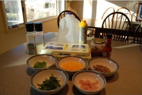 In a large bowl whisk three eggs, 1/4C of milk, salt, and pepper. Set aside.