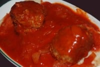 The meatball part of this dish can be made as large or small as you like. I favor making about eight large meatballs and serving one or two with a pile of mashed potatoes or thick cut slices of toasted bread, though sliced white sandwich bread works just fine too. We’ve occasionally served this with egg noodles as well, but I think it is at it’s absolute best with mashed or roasted potatoes. The one thing I do NOT recommend you do is substitue V8 or other juice blends for plain tomato juice, as the celery and spices that tend to be in them do not do anything good for the flavor of the overall dish. My mother would argue differently, but that would be why I learned this dish from my grandmother and not her. Her version never tasted right and it took me years to find out why.