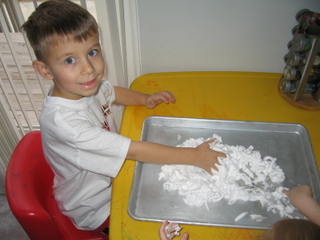 Preschoolers may get the shaving cream on their clothes or skin. The nice thing about working with shaving cream is that it is basically soap so it is very easy to clean up.