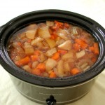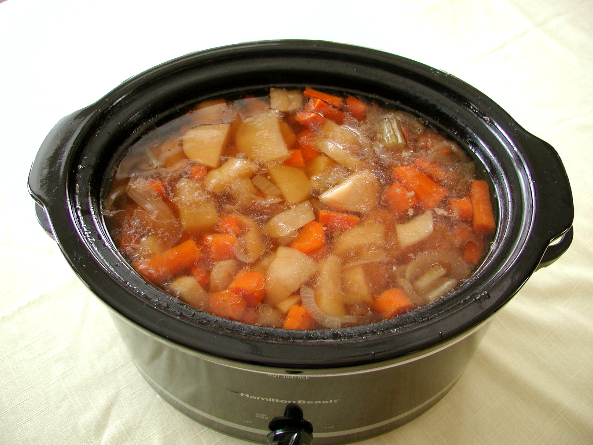 Add all of the vegetables. Cover with water leaving about an inch from the rim. Bring to a boil and then turn the slow cooker down to low. Cook 8-9 hours.