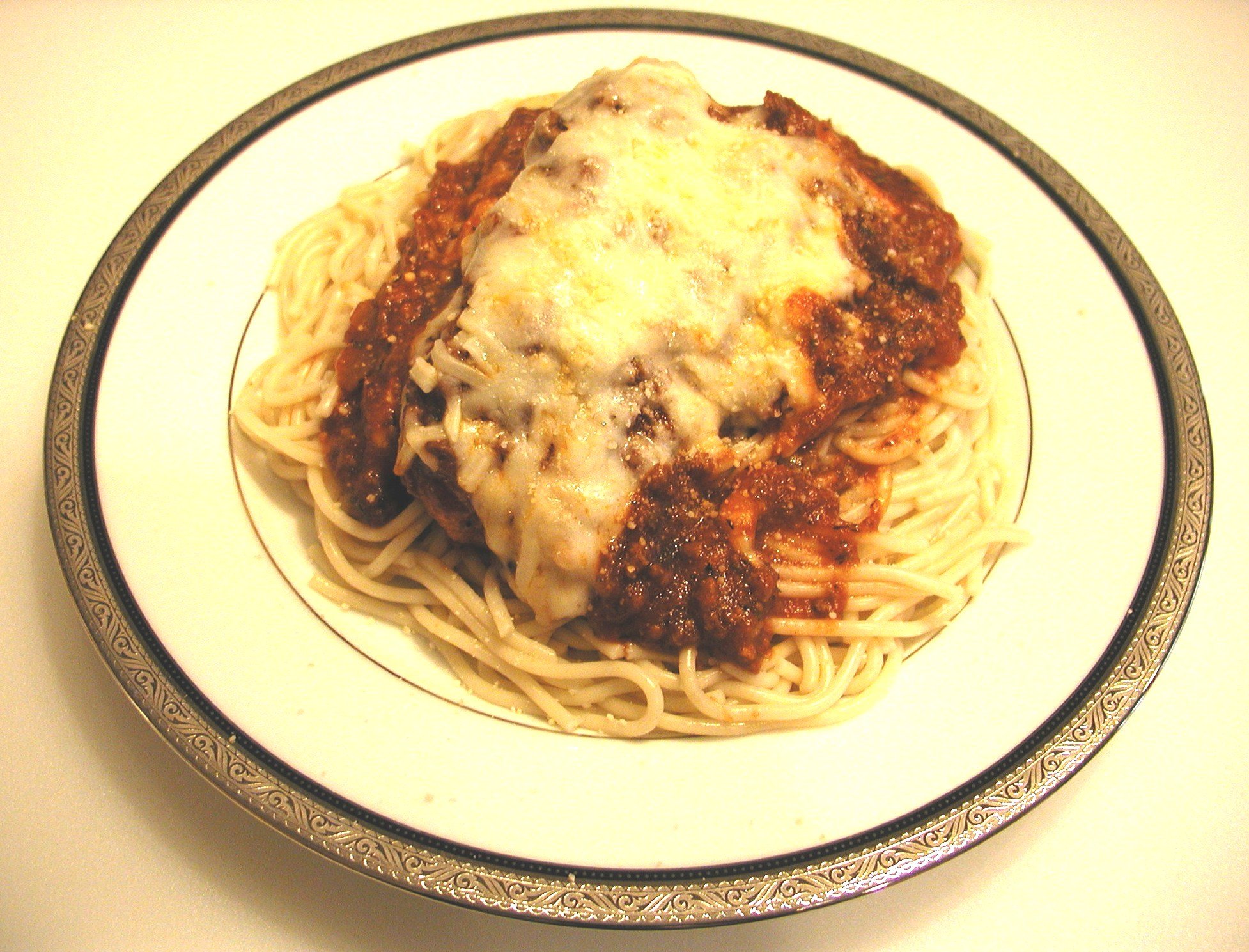To serve the Chicken Parmesan, put the pasta onto a plate and add the chicken and marinara sauce over the top.