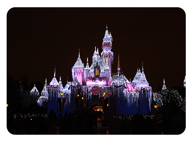At the end of the night, we were exhausted but my kids still had huge smiles on their face. As I sat and waited for them outside their third visit to the updated Star Tours ride, holiday music filled the air and I could see bright lights come from the direction of the castle. I was nearly asleep on my feet but the music drew me in. As I turned the corner and the castle came into view, it literally took my breath away.