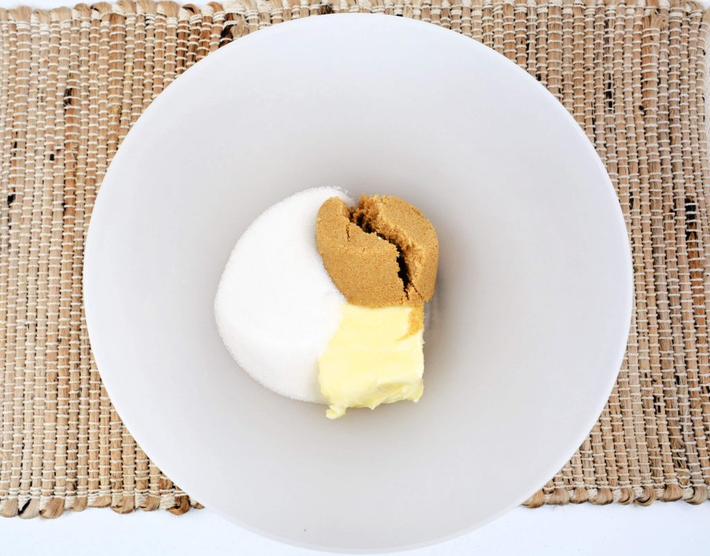 Combine the butter, brown sugar, and sugar in a large bowl with an electric mixer. Continue to mix for 1-2 minutes.
