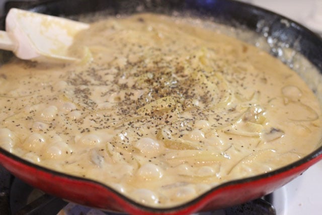 - Lower the heat and add the cream and worcestershire sauce. The cream will take on the color and flavors of the caramelized onions.
