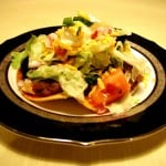 In a small skillet, add hamburger, half of the diced onion, salt and pepper. When the pink is gone, drain the hamburger. Put back on the stove and add 1/4-1/2 cup of enchilada sauce. The more enchilada sauce you add the hotter the hamburger will become. Let the sauce get bubbly and turn the skillet off.