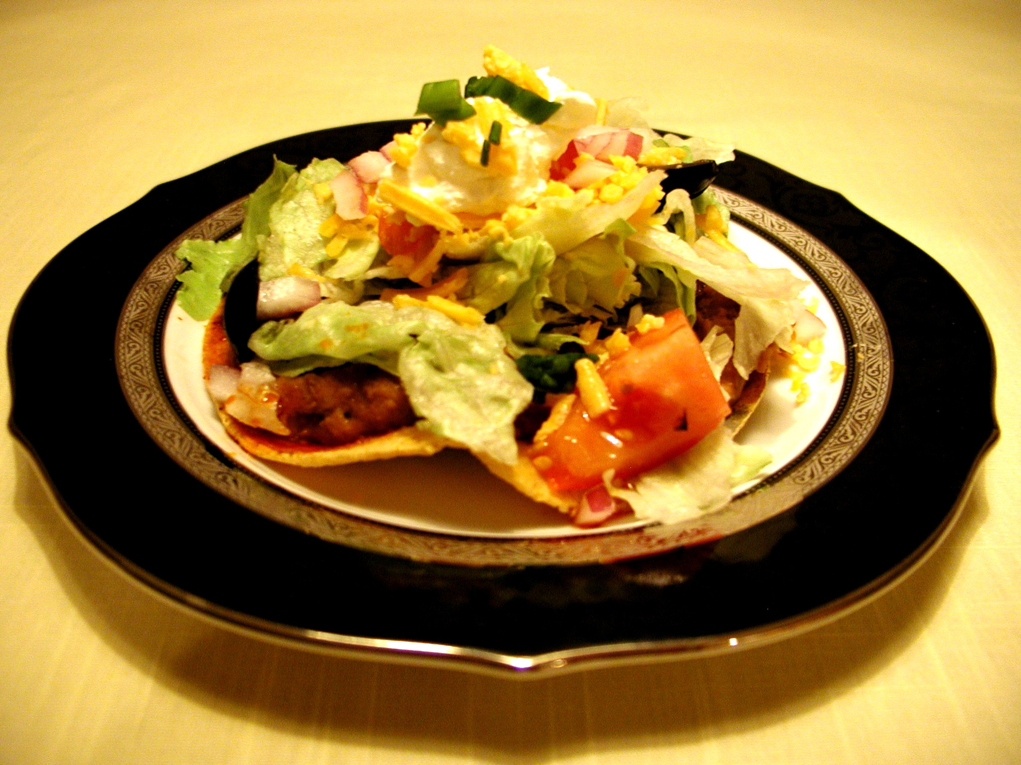Place the warm tostado on a plate. Spread a layer of the beans onto the tostado. Place 1/4 of the hamburger on the top of beams. Continue the layers by adding the lettuce and then add a sprinkling of tomatoes, onions, olives and cheese. Place a dollop of sour cream and guacamole on top. Serve salsa on the side.